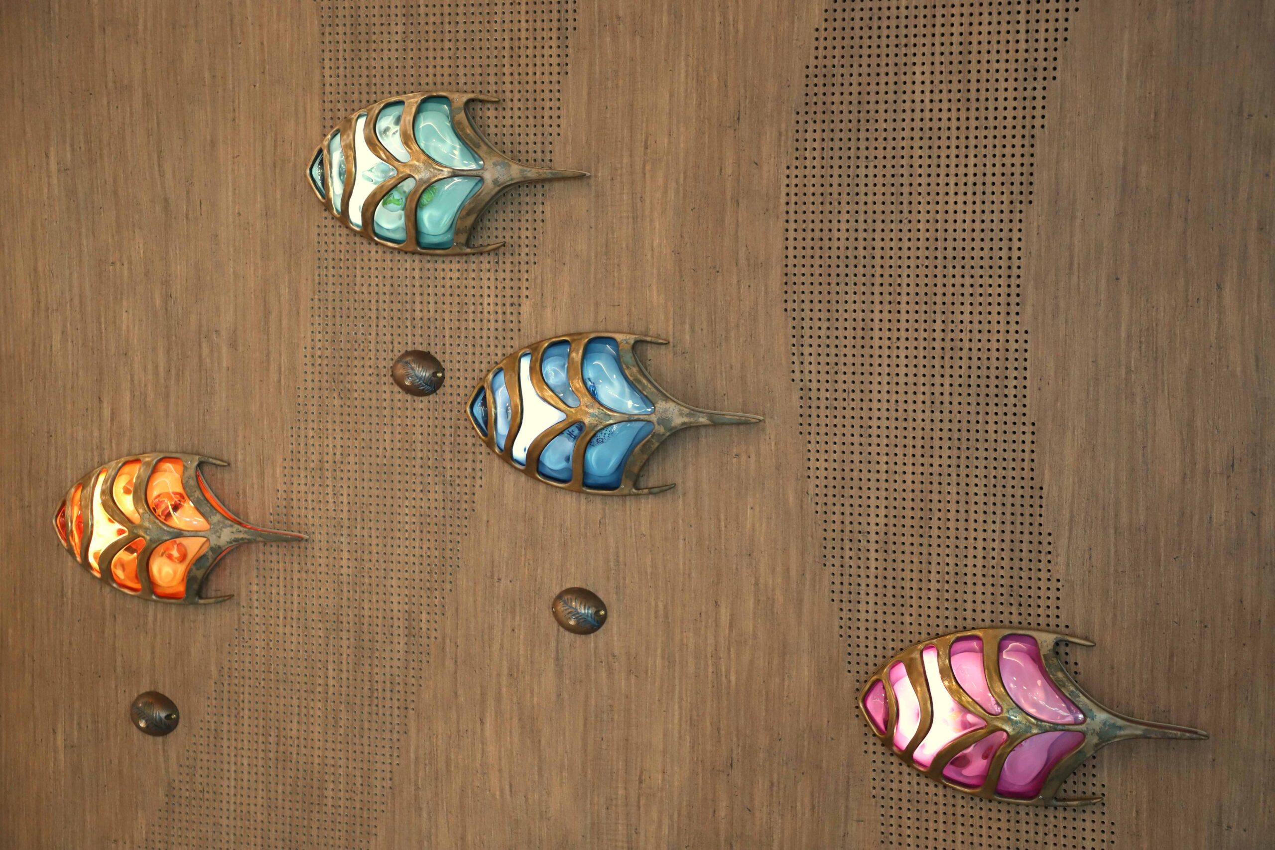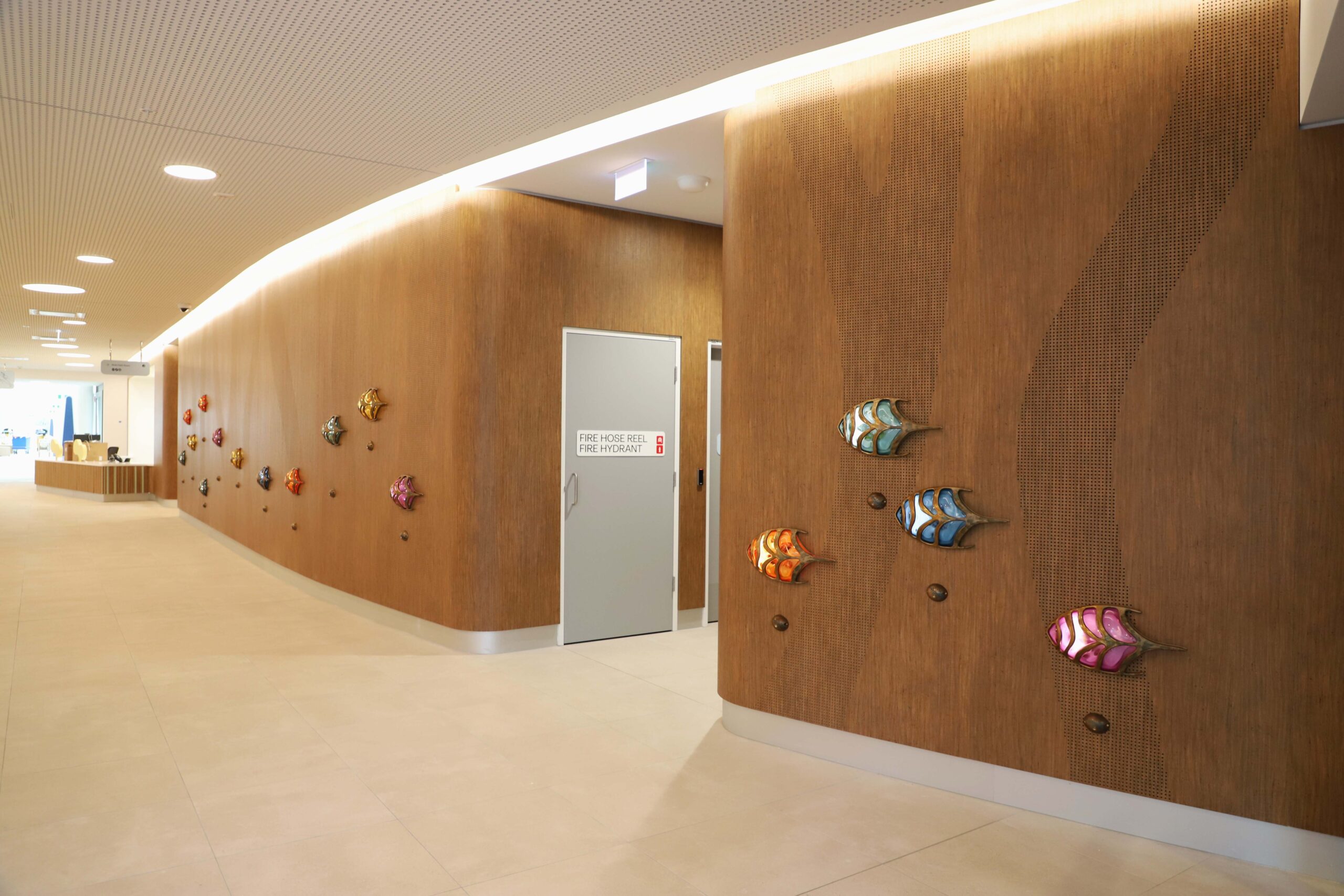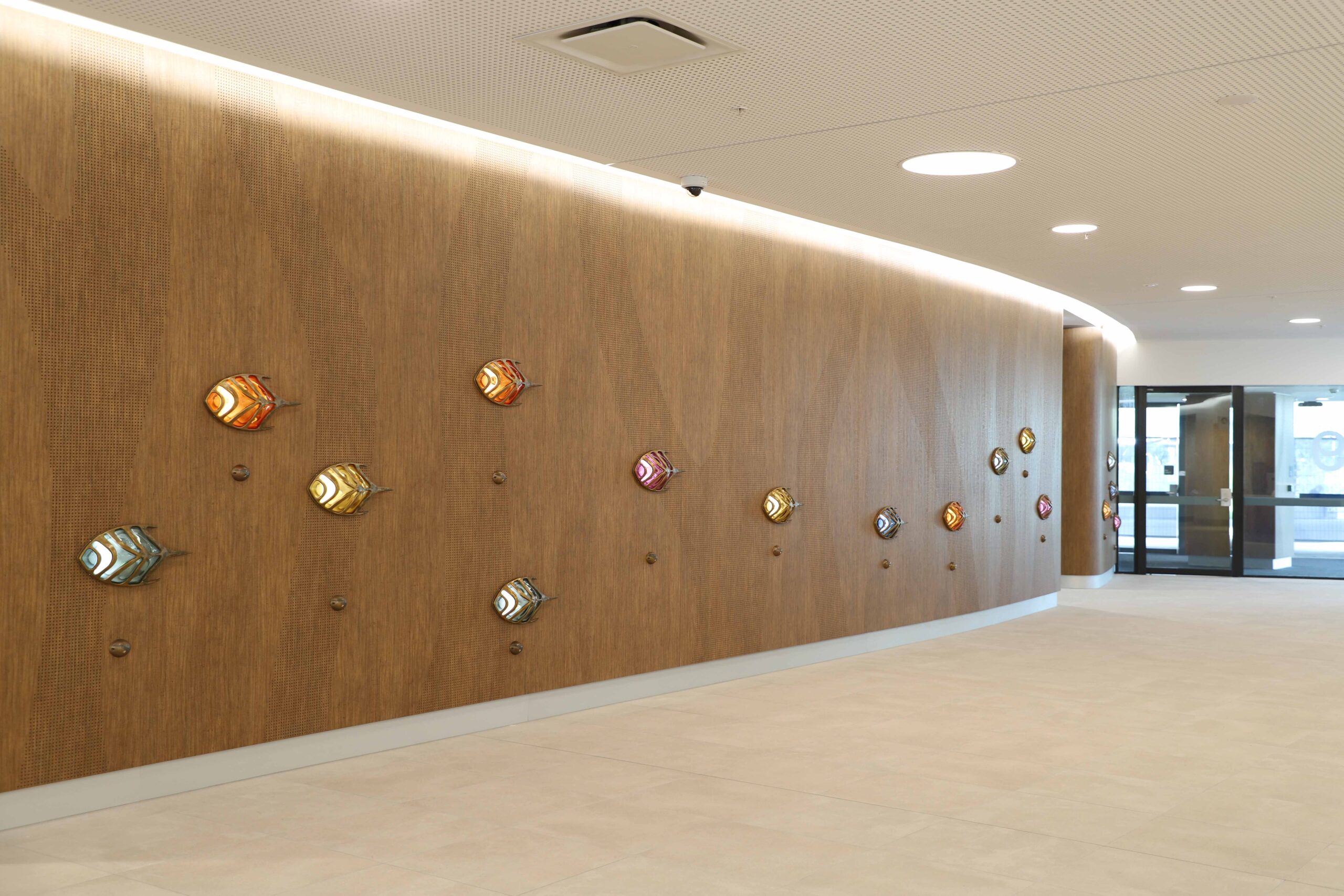 The artwork is an installation of sculptural lights on a timber wall that leads people through the foyer space as if dancing through the forest. They are colourful abstract creatures that are highly textured and respond to the presence of people by getting brighter as people get closer. Made of bronze, the creatures contain within them hand-painted ceramic blooms made in collaboration with students from Nepean Creative and Performing Arts High School. They are hidden within the creatures, encouraging people to view them up close.
