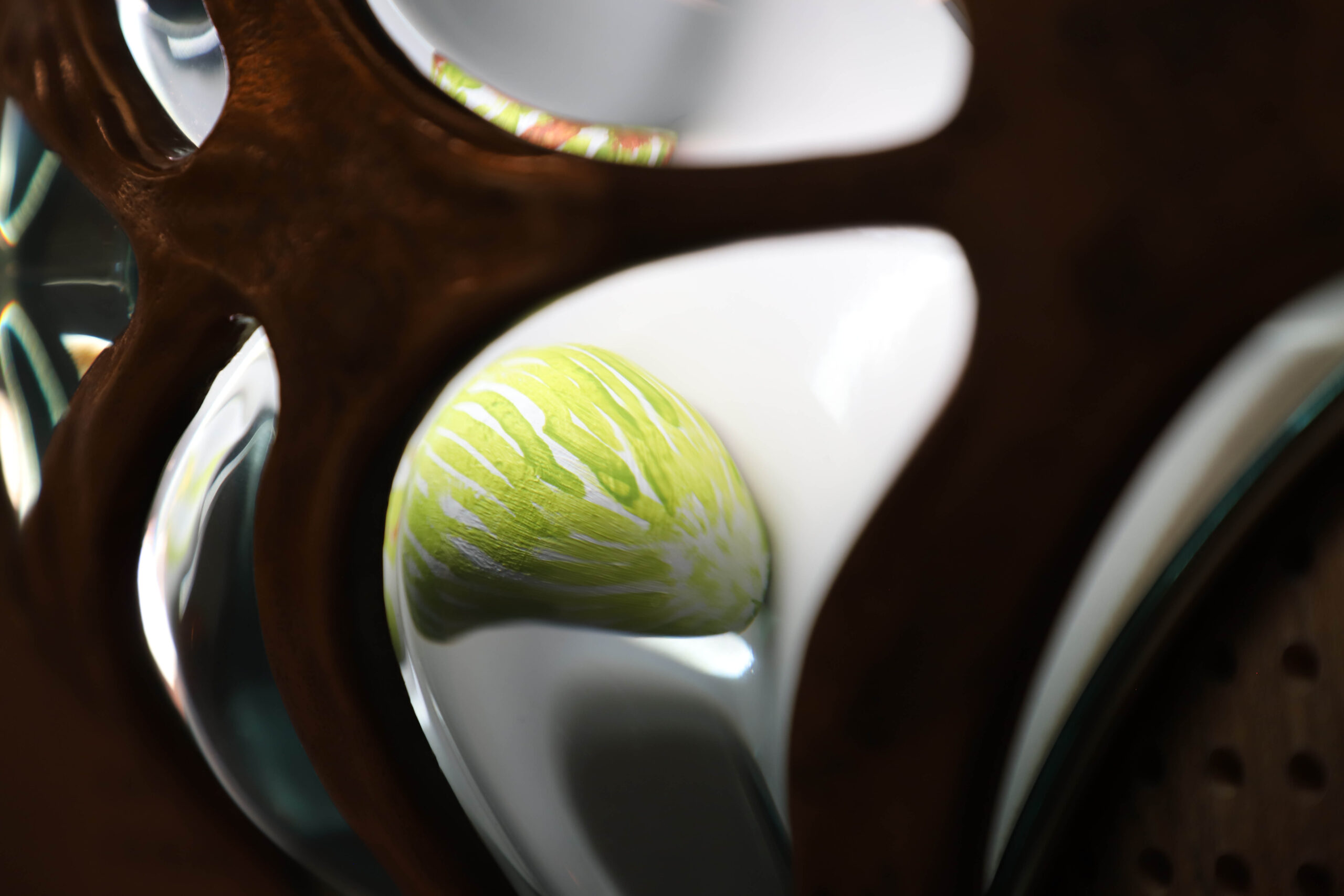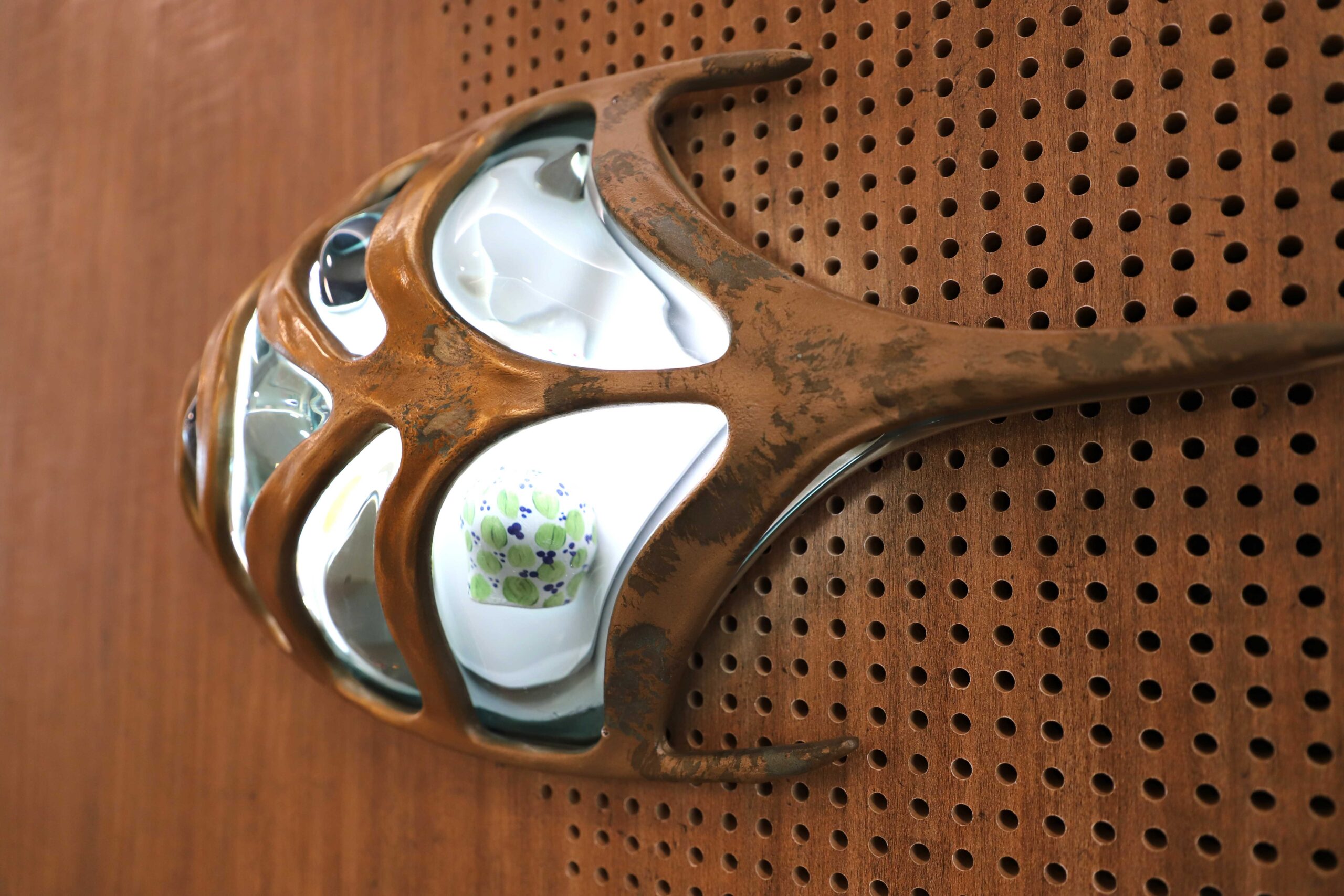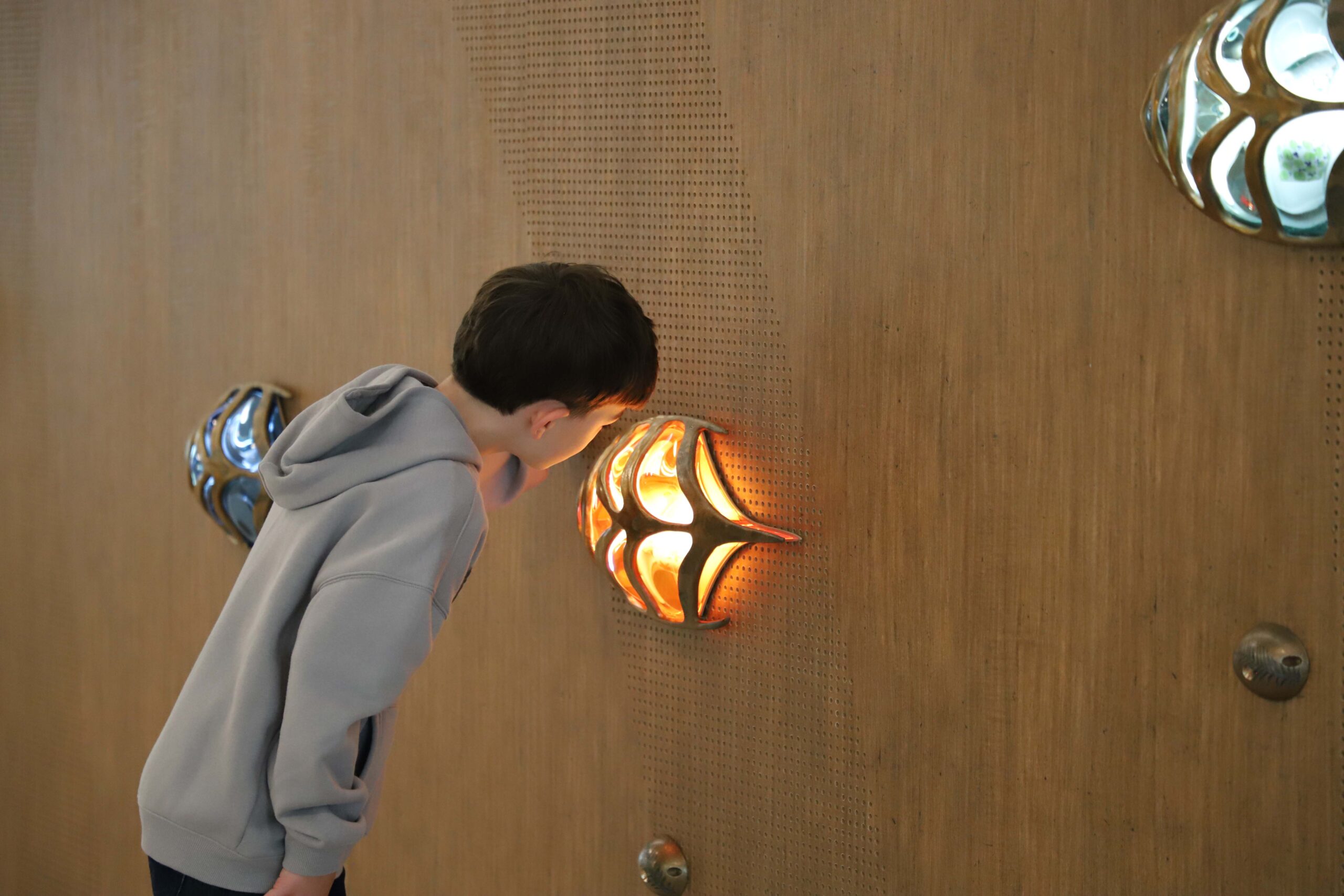 The artwork is an installation of sculptural lights on a timber wall that leads people through the foyer space as if dancing through the forest. They are colourful abstract creatures that are highly textured and respond to the presence of people by getting brighter as people get closer. Made of bronze, the creatures contain within them hand-painted ceramic blooms made in collaboration with students from Nepean Creative and Performing Arts High School. They are hidden within the creatures, encouraging people to view them up close.